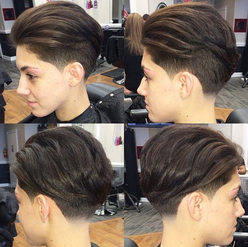 The short pixie hairstyle is cool with its side bangs, long sides and heavily shaved edges.